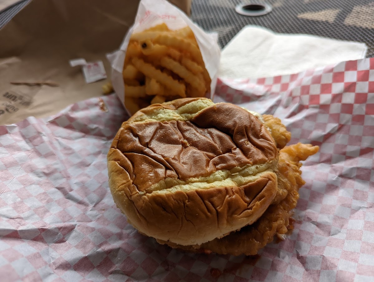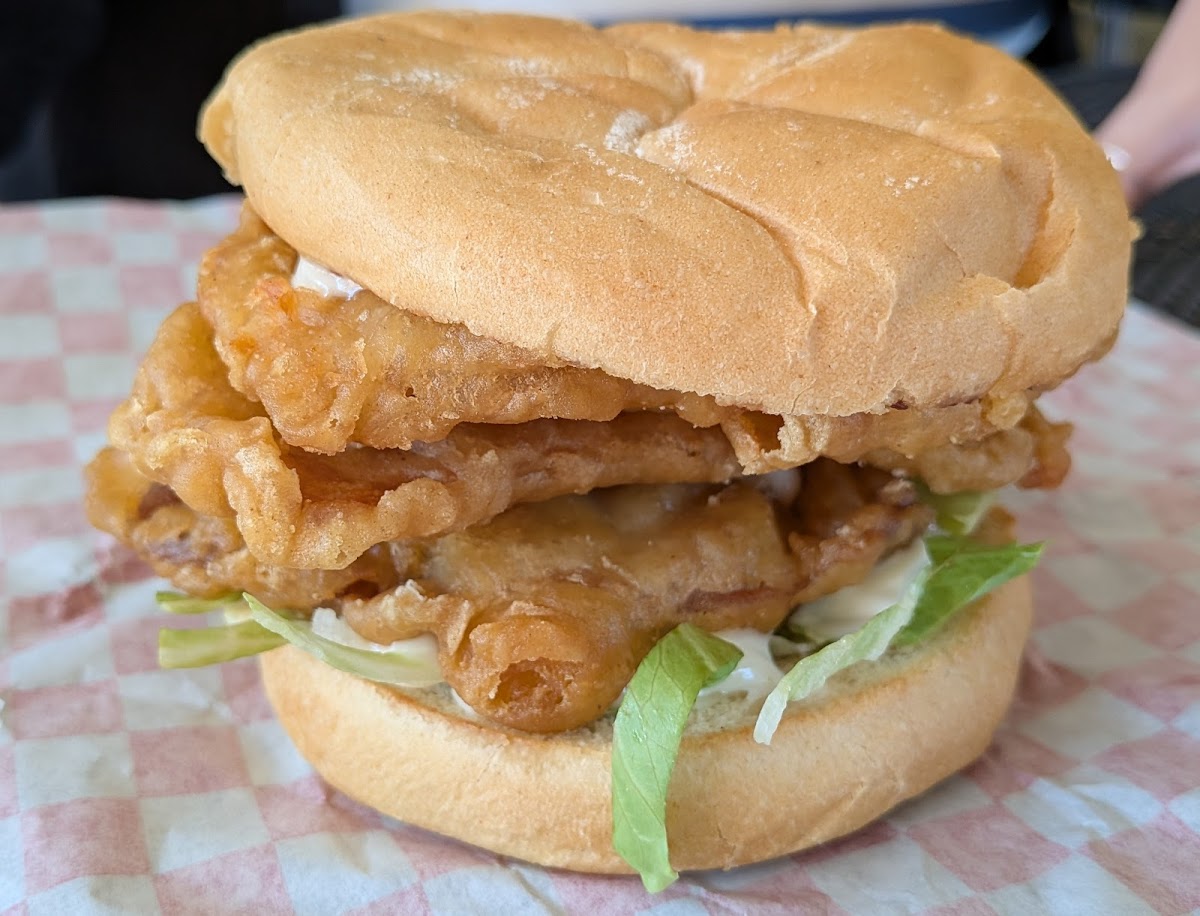 Fantastic pork tenderloin sandwich. Great batter that had the perfect crunch without being dry or greasy. It is outside seating only (though there is a roof) so go on a nice day. I got excited abd had already taken several bites of the sandwich before I remembered to take a picture, so it's a little squished